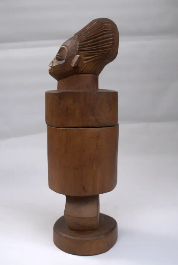 Boîtier à bijoux en bois doré sculpté de Kikwit (RDC), figurant un personnage féminin avec couvercle. Mesurant: 32,5 x 11 cm et pesant : 1 kg.