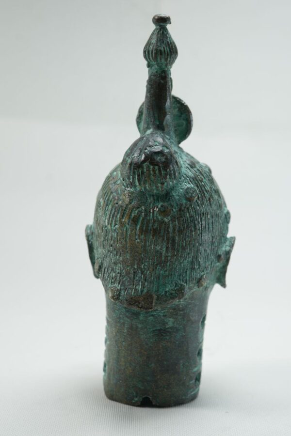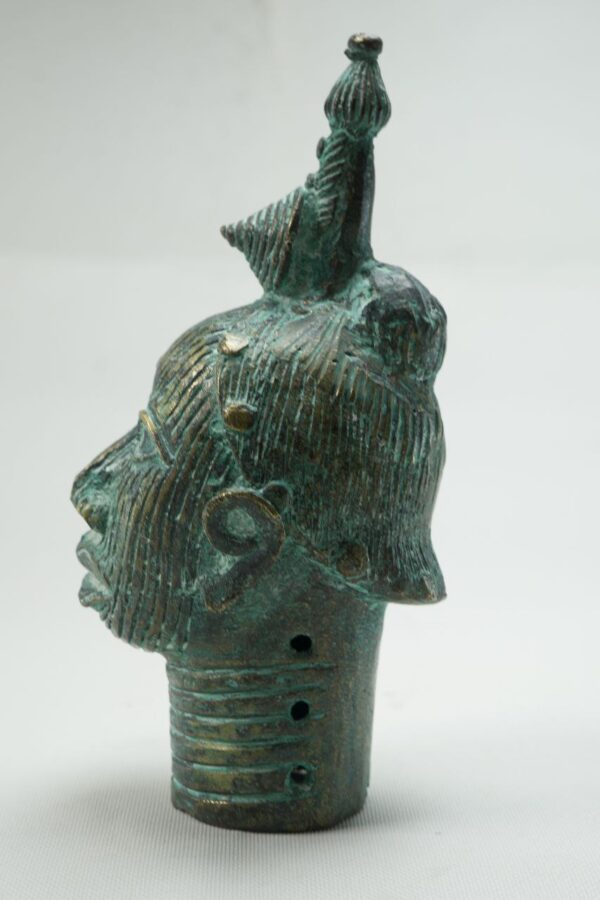 Sculpture en bronze représentant un roi d’Ifè. Réalisée selon la technique traditionnelle de la cire perdue, elle mesure 18 cm de hauteur pour un poids de 0,45 kg
