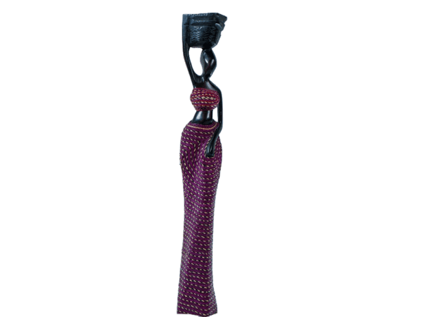 Objet de décoration en bois d’ébène recouvert de raphias, représentant une femme africaine portant de l’eau. Cette sculpture d’art moderne mesure 46 cm de hauteur avec une base de 6 cm, et pèse 0,75 kg.