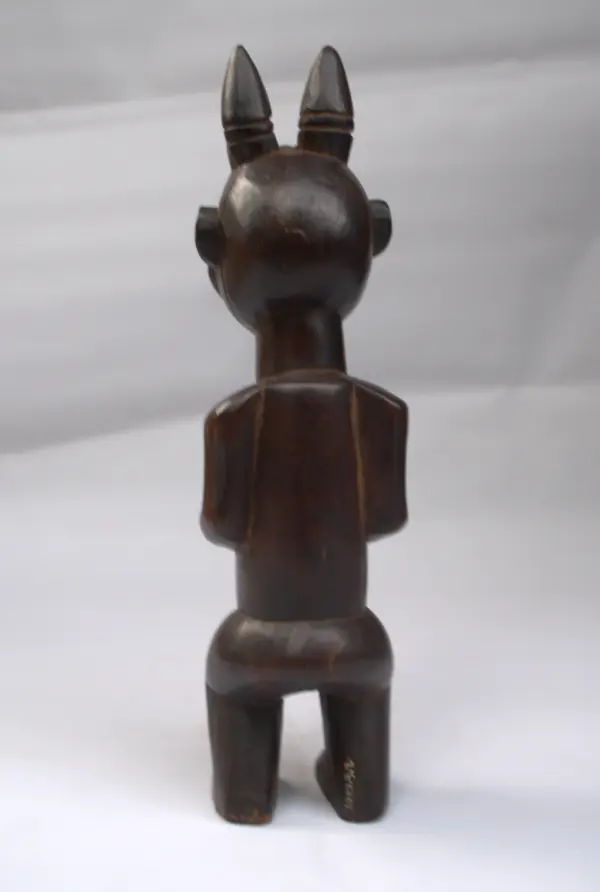 Statuette en bois Suku de Bandundu (RDC), représentant un homme dont la tête évoque un hibou. Symbolise le pouvoir d’un sorcier. Mesurant : 28 x 8 cm et pesant : 0,9 kg.