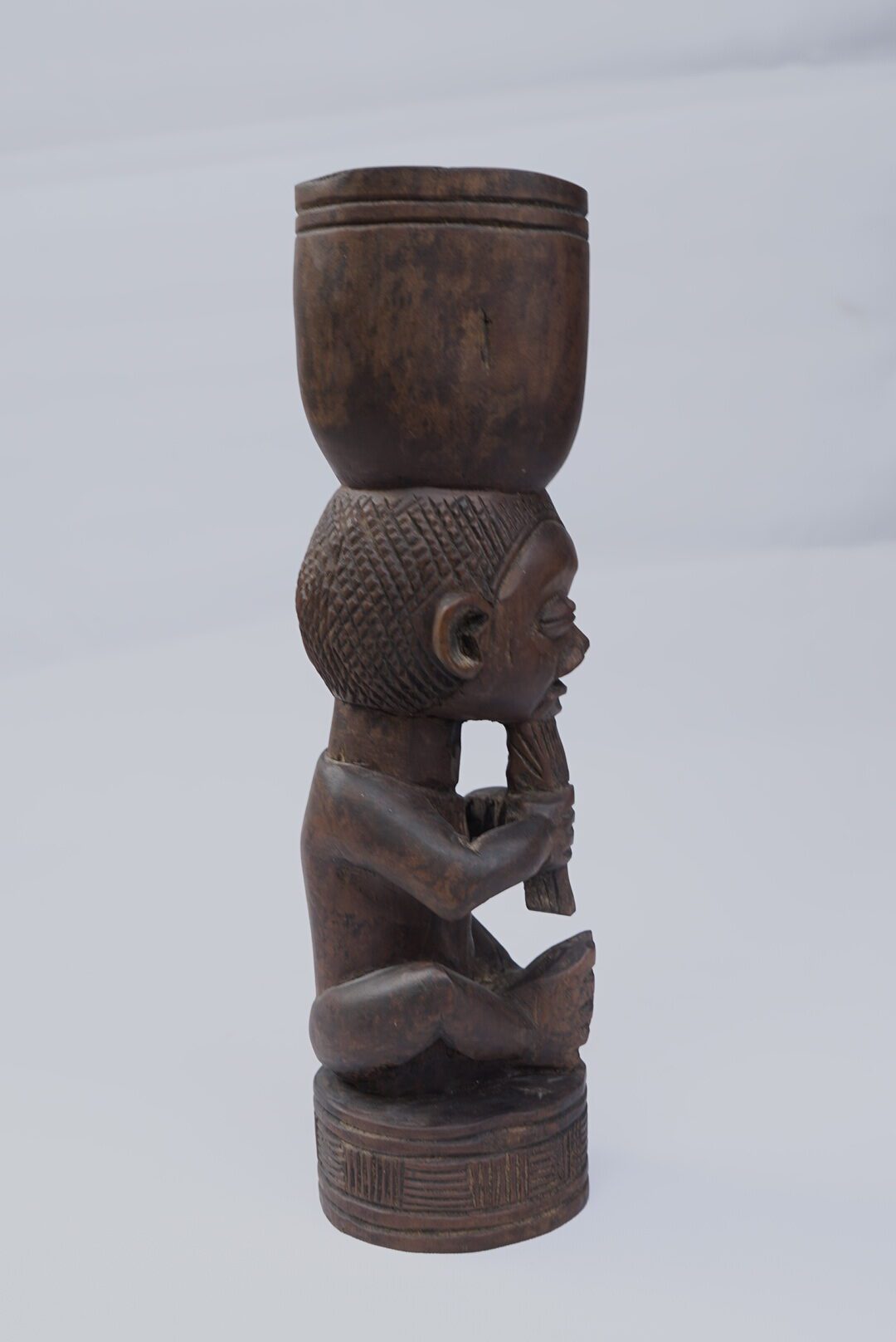 Statuette en bois doré sculpté de Kikwit (RDC), représentant un personnage tenant sa barbe. Mesurant : 27 x 7 cm et pesant : 0,5 kg.
